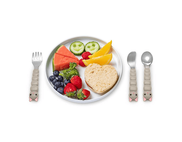 El tenedor, el cuchillo y la cuchara de acero inoxidable con mangos gruesos y redondeados son fáciles de sujetar por las manitos pequeñas y ayudan a los niños a aprender a alimentarse solos.