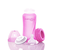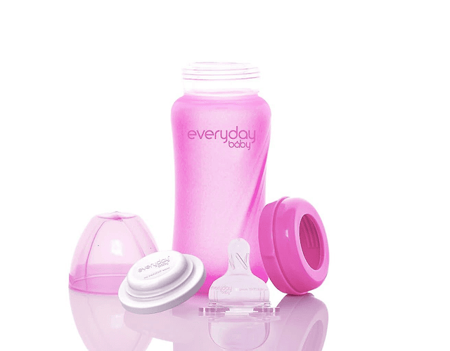 La mamadera indica cuando el líquido está demasiado caliente para tu bebé, por encima de los 40° C, cambiando de color a blanco. Cuando está a la temperatura adecuada vuelve a su color original.